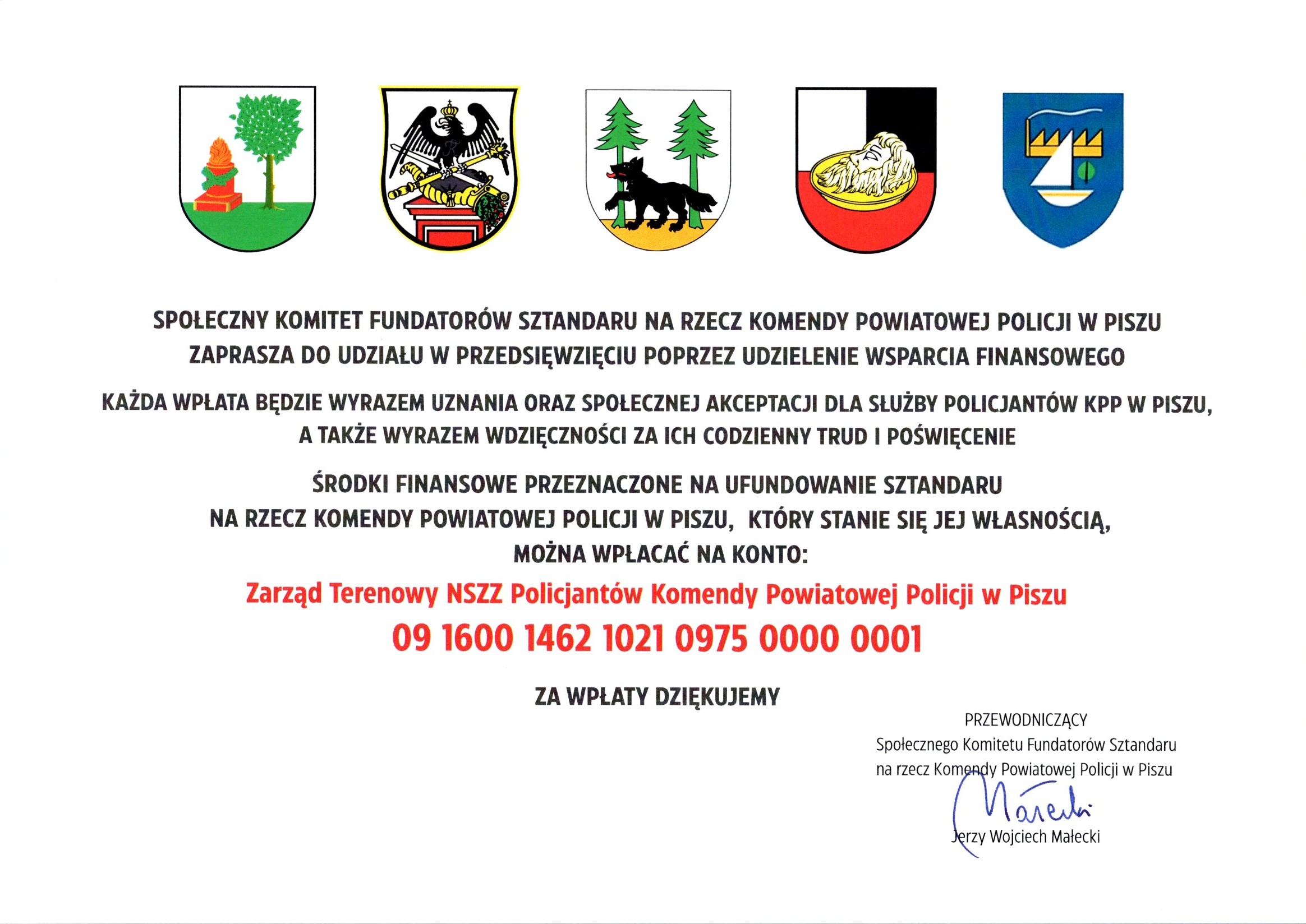 W imieniu Komitetu Honorowego zwracamy się z uprzejmą prośbą do mieszkańców, instytucji oraz podmiotów działających na terenie powiatu piskiego o wsparcie finansowe tej doniosłej inicjatywy.